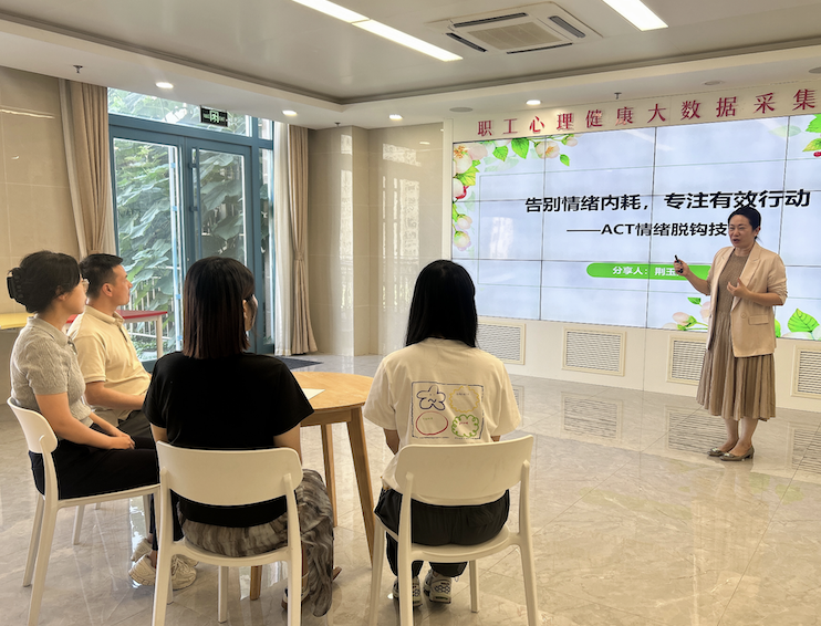 巩斐讲师以《成长关卡:向内探索之旅》为主题,创新推出“沉浸式关卡体验”活动,将成长中的常见心理挑战,具象化为“踢毽子”“夹豆子”“平衡术”“同心协力”等十个递进式关卡,引导大家从“被动应对”转向“主动觉察”。宗岩讲师以《解锁快乐多巴胺,拥抱阳光好心态》为主题展开分享,从神经递质理论出发,精心设计“海豚与海鸥”“信任之旅”“纸飞机寄语”三款心理游戏,系统解读多巴胺、血清素等四种物质对职工工作动力、情绪、人际及压力缓解的关键作用。荆玉娟讲师带来《ACT 情绪脱钩技术:告别情绪内耗,专注有效行动》主题分享,以接纳承诺疗法(ACT)为核心框架,细致拆解“情绪脱钩”的实操步骤与核心要领,带领大家开展“价值探索”专项练习,为职工破解情绪内耗难题提供了实用工具。董静讲师以《有趣好玩的认知行为(CBT)》为主题,聚焦职工日常中常见的“自动负面想法”,通过趣味十足的互动环节与贴合生活的案例分析,带领大家深入探寻这些消极想法的形成根源,同时系统传授改变认知偏差的具体方法。大家在欢声笑语中轻松掌握了认知行为疗法等理论的核心逻辑,为今后以更积极、理性的认知面对生活难题提供了有力支撑。