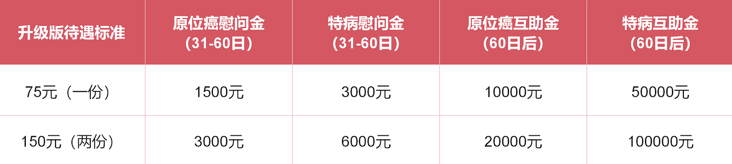 升级版(75元/份):将女职工特定疾病保障额度大幅提升至5万元/份,为女职工提供更强有力的风险抵御能力。